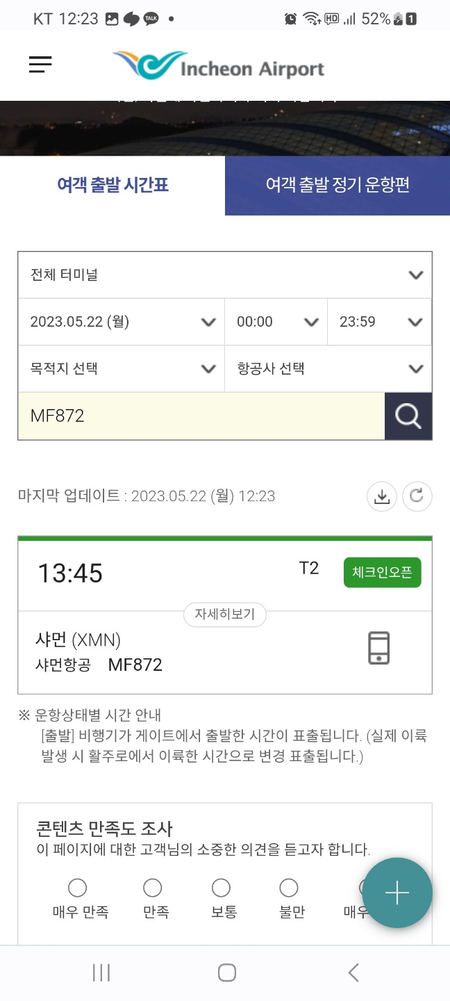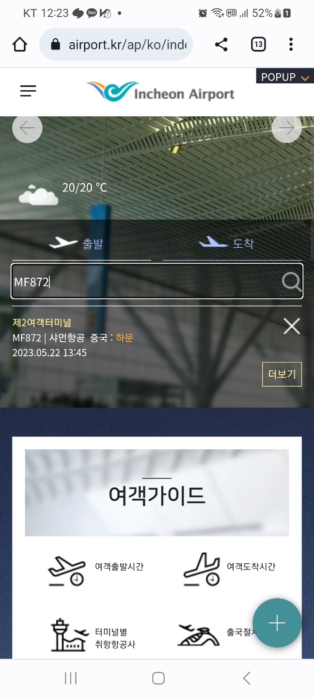비행기 편명을 넣으면 정보가 뜬다. 어느 항공사인지 어디로 가는지 몇월 몇일 몇시 비행기인지 확인 가능하다. 그리고 옆에 '더보기'를 누른다.