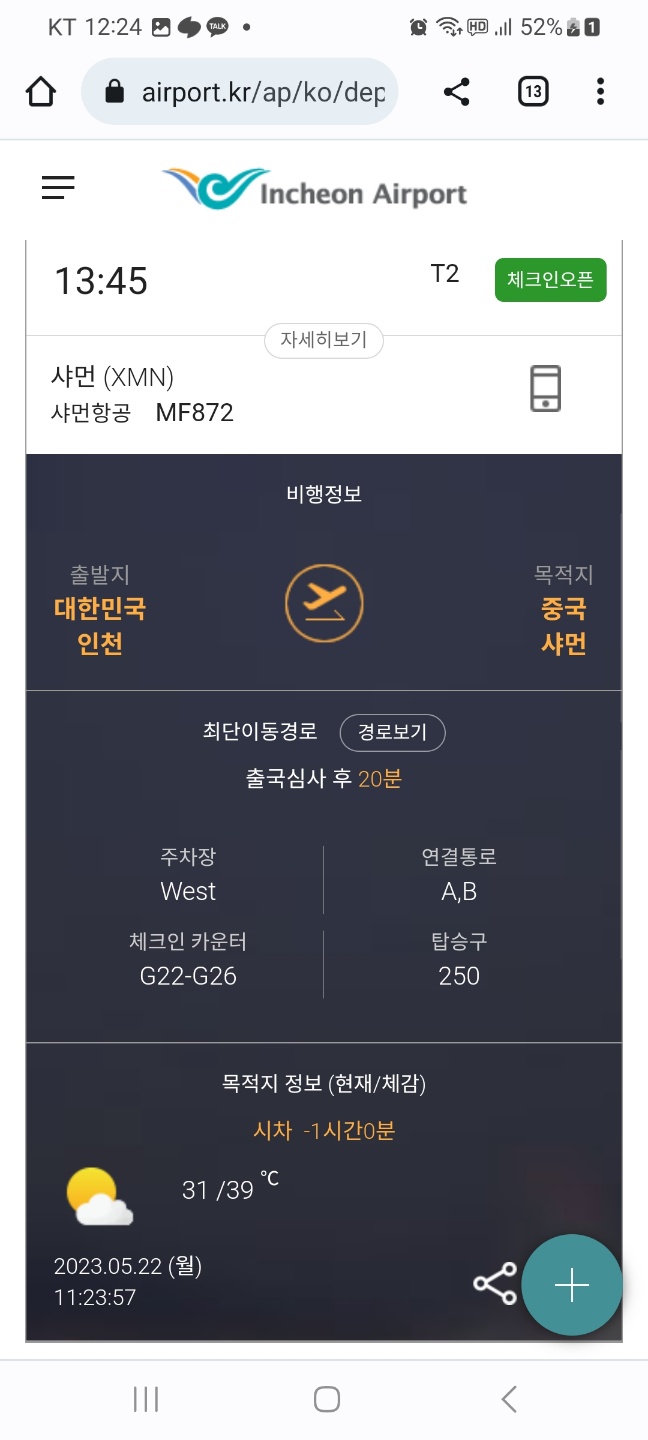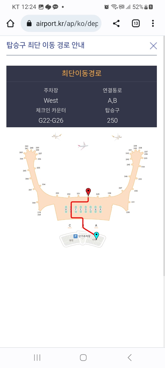 주차장은 West에 하는 것이 가장 가깝고, 체크인 카운터는 G22-G26에 있고, 연결통로는 A,B, 탑승구는 250, 목적지 정보로 시차와 온도까지 나온다. 공항 안으로 들어가자마자 G카운터로 간다. 그리고 비행기티켓을 받아 A,B 연결통로로 들어가 짐검사와 여권 스캔을 끝내고 탑승구 250, Gate 250으로 가서 비행기를 탄다.