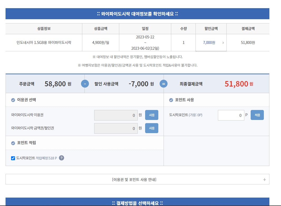 제일 비싼 무제한으로 하려고 보니 거의 10만원돈인데 후기를 찾아보니 잘 안 터진다는 이야기도 좀 있었다. 어떤 사람은 아무데서나 너무 잘 터진다. 어떤 사람은 상담사 톡으로 상담까지 했는데도 해결안되고 무제한으로 가져가서도 많이 못 썼다고 했다. 나는 그동안 와이파이 도시락을 몇 번 사용했지만 문제가 있었던 적은 없었다. 고민이 돼서 그냥 제일 용량이 적은 1.5GB로 결정했다. 내가 인터넷을 많이 사용해야 하는 이유가 있는 것도 아니고, 호텔이나 식당에서도 와이파이는 되니까 그냥 제일 낮은걸로 써보기로 했다. 그 후기는 사용하고 와서 추가로 남길 것이다.